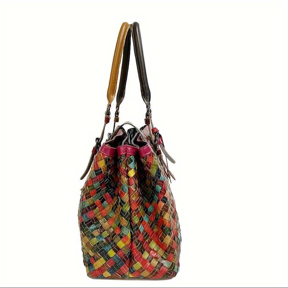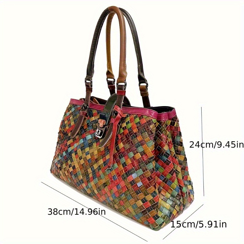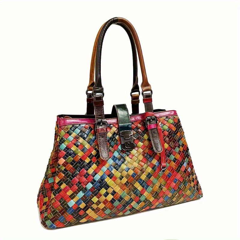 Colorful contrasting woven genuine leather women's handbag - retro ethnic style shoulder and crossbody handbag