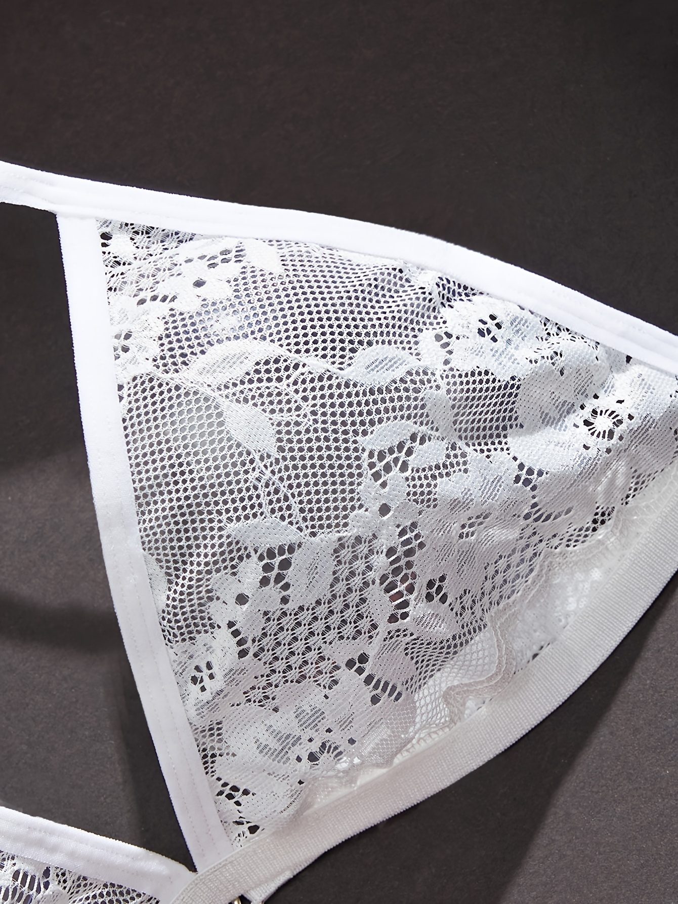 Preppy Plaid Print Uniform Set, Floral Lace Triangle Halter Bra & Thong & Skirt & Tie, Women'S Sexy Lingerie & Underwear